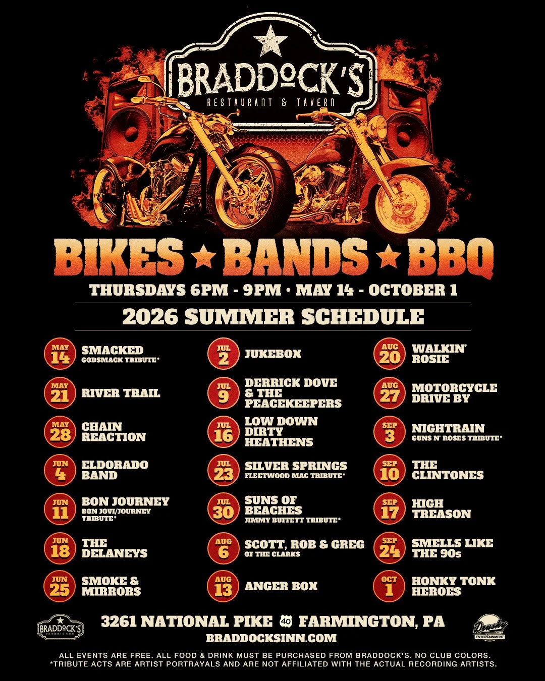 Join the Braddock’s crew for what they do best, and stop by every Thursday t0 enjoy an evening of cold brews, hot BBQ by Chef Derek, motorcycles, live entertainment, and fun times with friends. Whether you eat on the lawn and stay for the show, or get something to go, Chef Derek’s BBQ is the right choice for dinner every Thursday evening all summer long.
